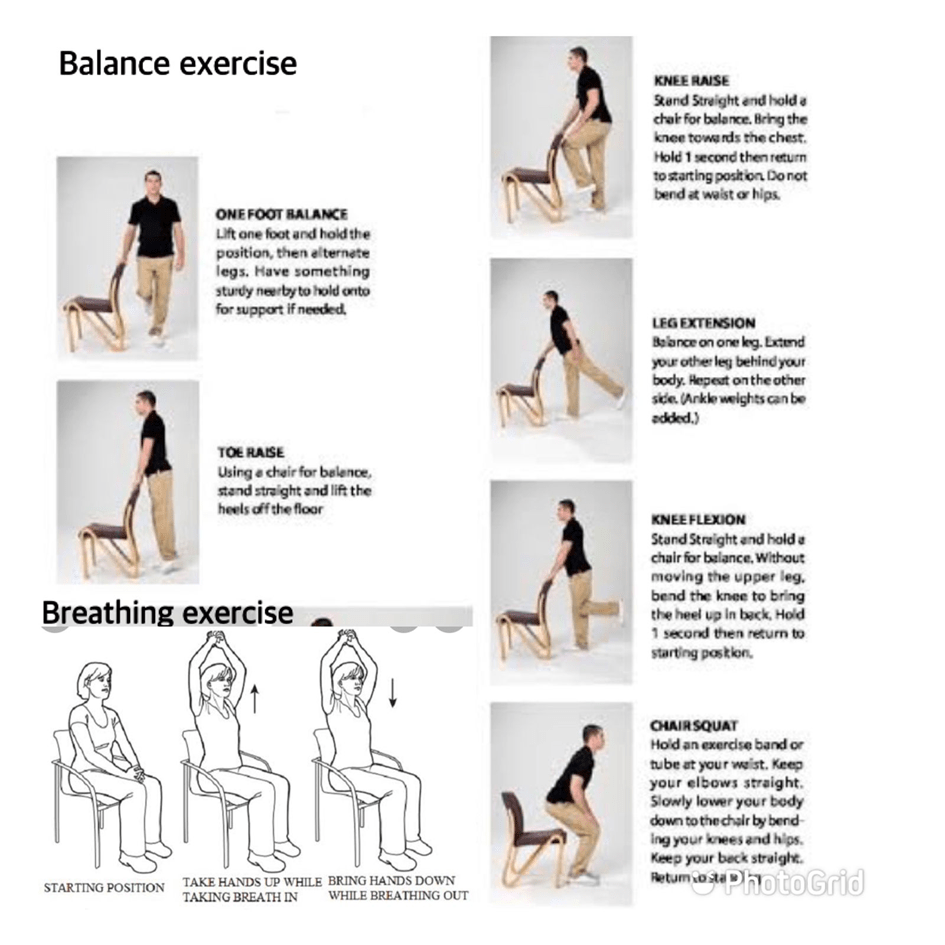 To start with, do every exercise twice daily 10 reps. All the balance exercises should be done under observation or around someone.